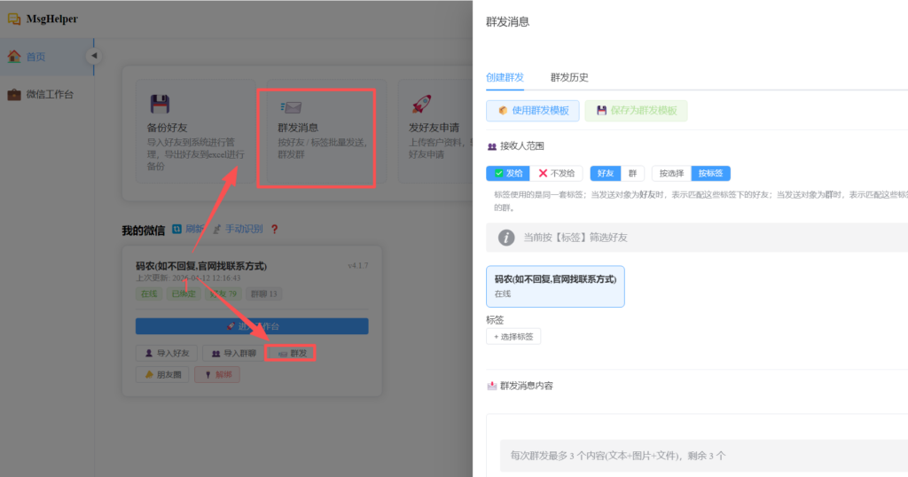“群发消息”功能允许您将一条或多条包含文字、图片、文件的消息,批量发送给符合条件的微信联系人。它支持按标签筛选接收人、排除特定好友、设置发送节奏、检测异常好友、定时发送以及断点续发等高级操作,是进行客户触达与运营的核心工具。