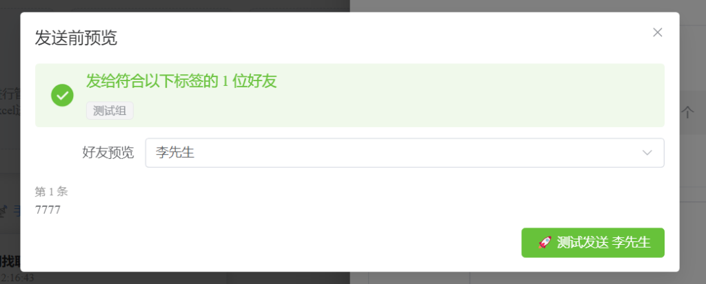 点击“发送前预览”,可以查看完整的消息内容和即将接收消息的部分联系人列表(最多显示10人)。所有发送操作在执行前,系统都会进行两次敏感词检测(前端点击时和后端启动时),以确保内容安全。