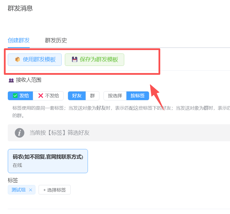 - 区别:从工作台进入时,您已勾选的好友会自动填入接收人列表;从首页进入时,默认模式为“按标签”筛选。