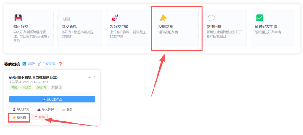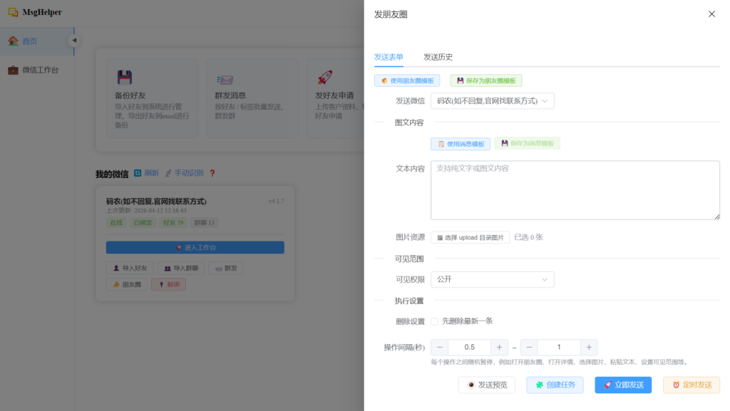“发朋友圈”功能能够帮助您自动、批量地发布图文内容到微信朋友圈。它支持以下核心能力: