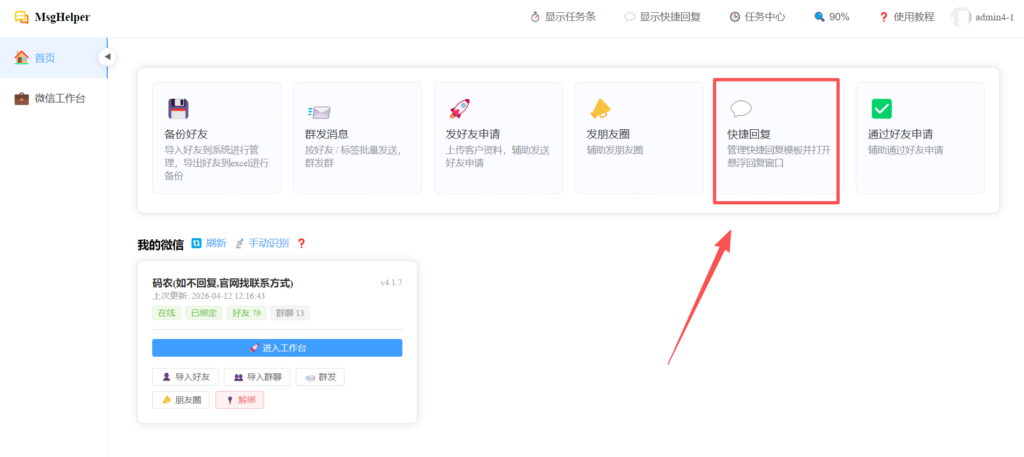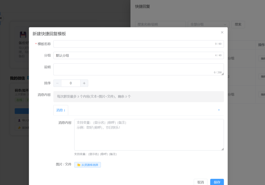 “快捷回复”功能让您能够预先编辑好常用的消息模板(可包含文字、图片、文件),在与微信好友聊天时,可以一键快速发送,无需反复复制粘贴。此功能非常适合客服场景、发送固定通知、传递常用文件,可大幅提升日常沟通的效率。
