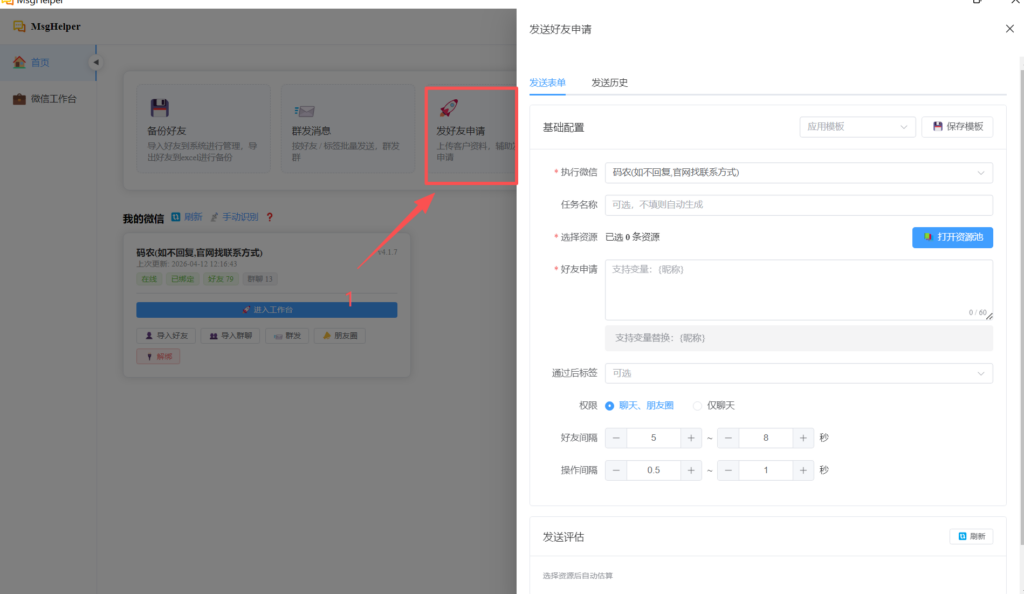 • SEO关键词 (Keywords): 发送好友申请, 批量加好友, 微信加人, 资源池管理, 定时加好友, 好友申请文案, 间隔参数, 失败补发, 任务中心, 私域引流