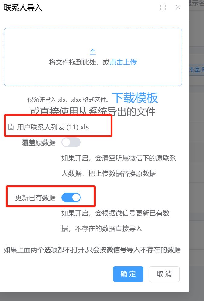 - “更新已有数据”:系统会根据Excel中的“微信号”匹配现有联系人,更新其信息;Excel中不存在的好友将保持不变。