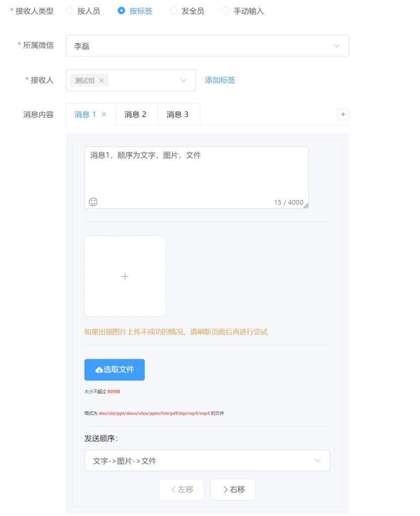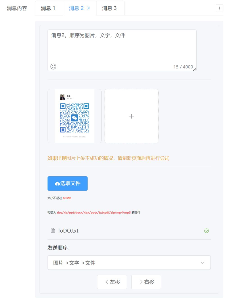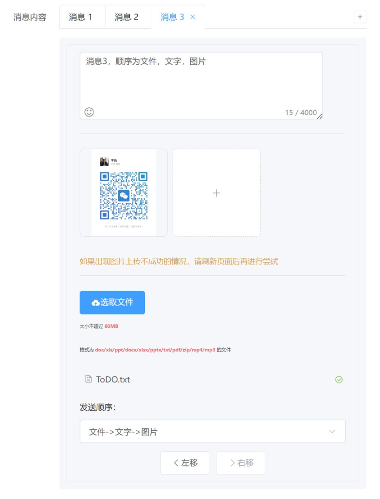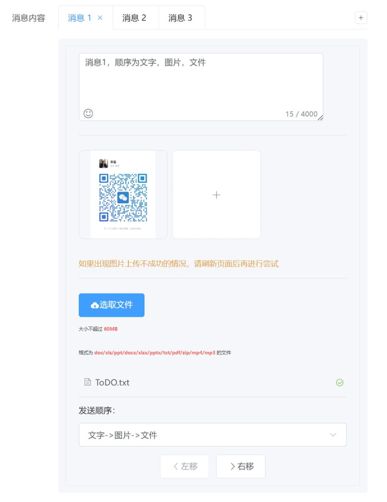 - 顺序下拉菜单:为每条消息指定文字、图片、文件的发送顺序